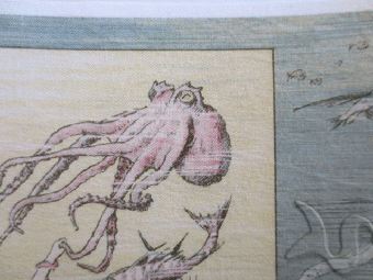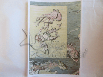 Immerse yourself in the captivating scene of a mother mermaid racing to find a safe haven with her baby, evading the clutches of a lurking octopus. This enchanting fabric block is a faithful reproduction of a pre-shrunk, pre-washed vintage mermaid fabric, exuding timeless charm.